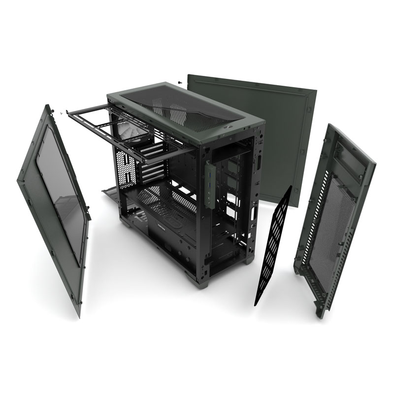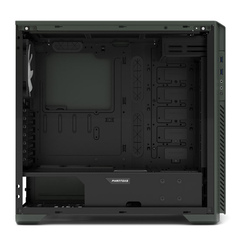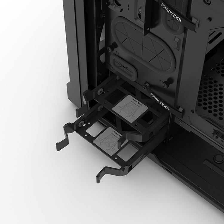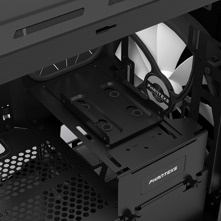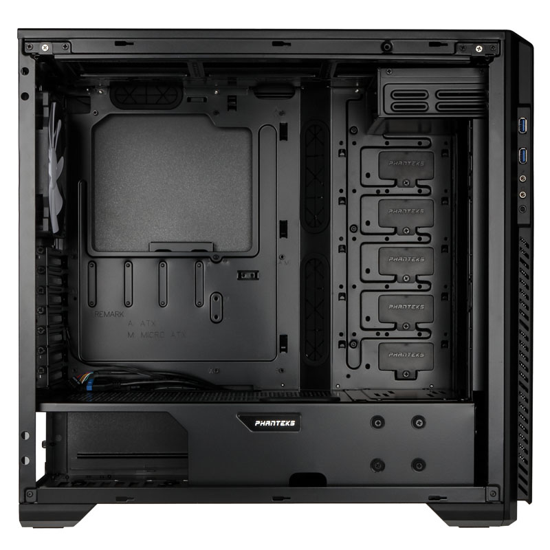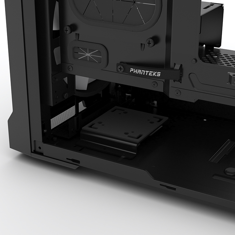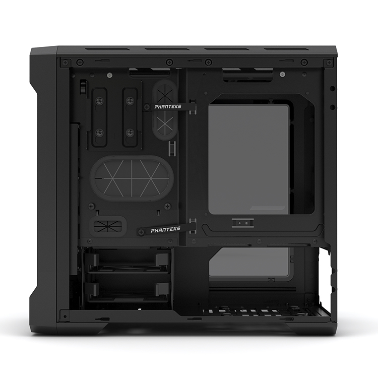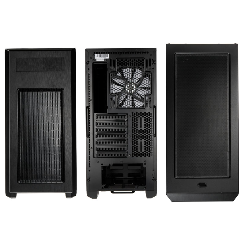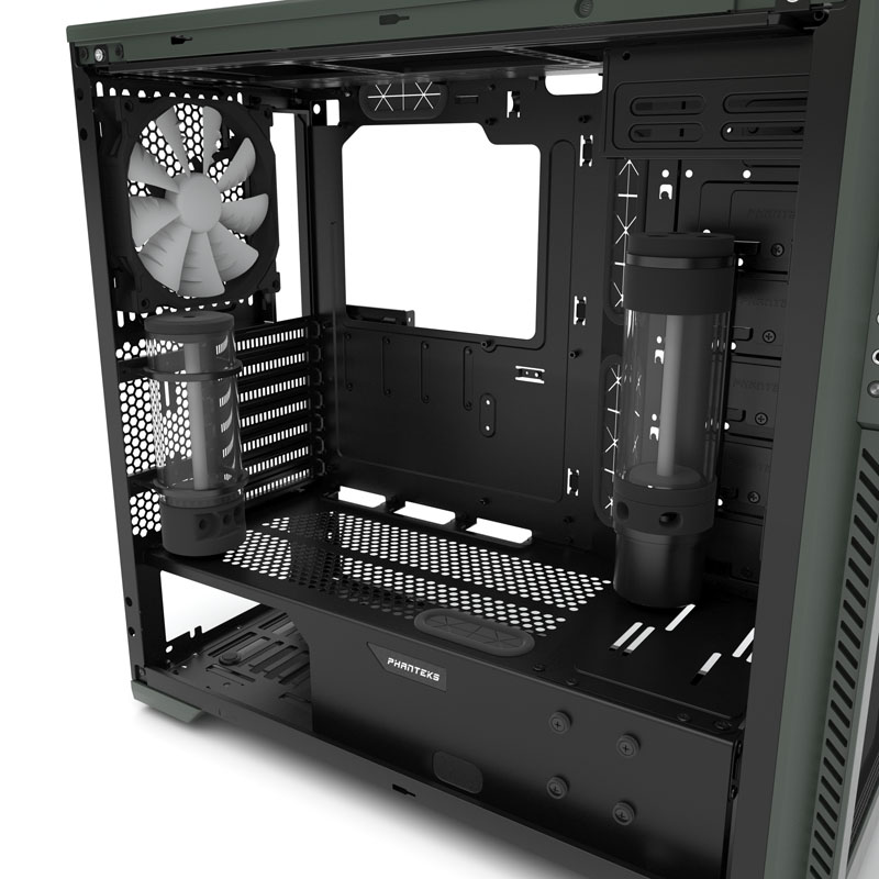 Côté refroidissement il est fourni avec un ventilateur 140mm à l'arrière (PH-F140SP). En pratique il peut accueillir en prime deux 140mm à l'avant (ou trois 120mm en sacrifiant la cage pour lecteur optique) et deux 140mm sur le dessus (ou trois 120mm). On pourra préférer mettre à ces emplacements des radiateurs pour watercooling, jusque 360mm pour les modèles de 120 de large, et jusque 280mm pour les 140 de large.