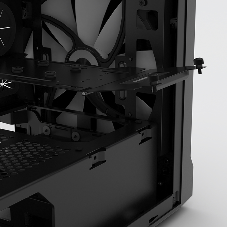 Le refroidissement est assuré par défaut par un ventilateur de 200mm en façade, il est possible de mettre 2 ventilateurs 140/120mm à cet endroit ainsi qu'au-dessus, contre un ventilateur 140/120mm à l'arrière. Côté watercooling on peut intégrer un radiateur 140/120mm à l'arrière, un 240mm en haut ou en façade, ou un 280mm en haut. Des brackets permettant d'intégrer une pompe et un réservoir sont fournis, la pompe prend la place des deux emplacements 3.5" et le réservoir se positionne au-dessus du cache carte graphique.