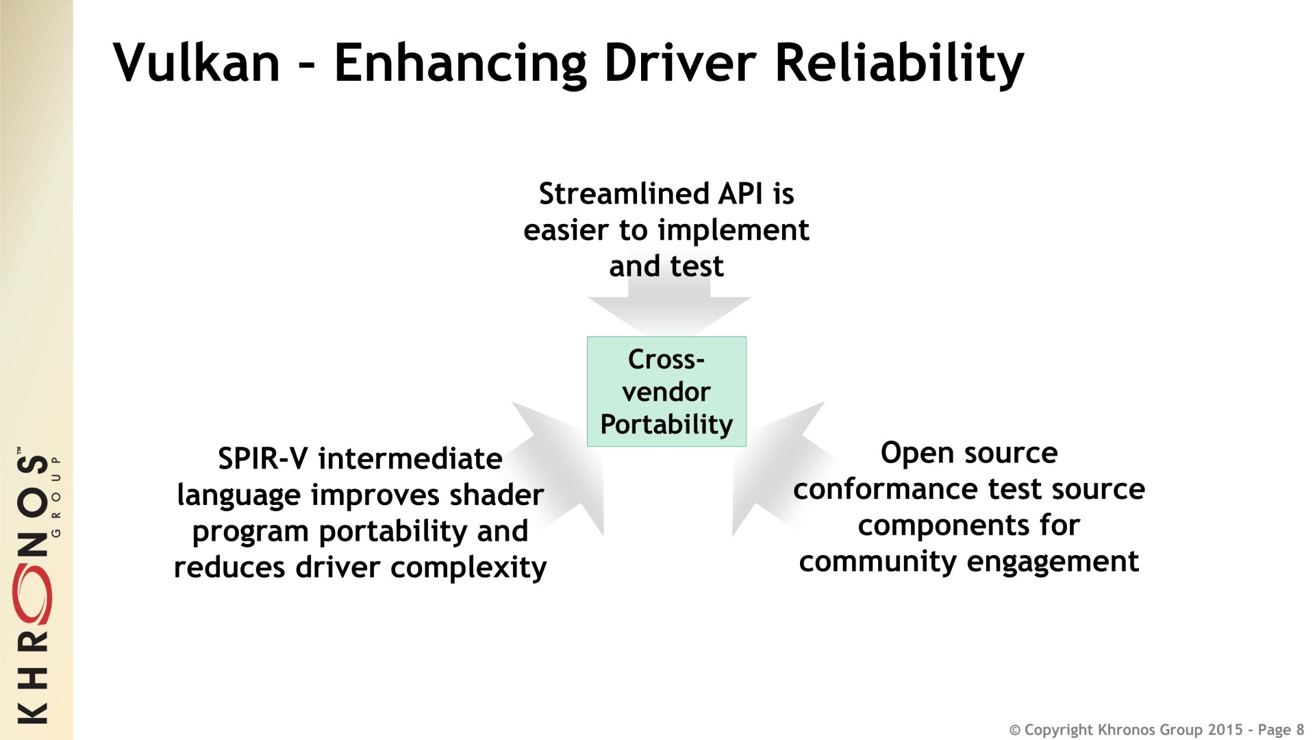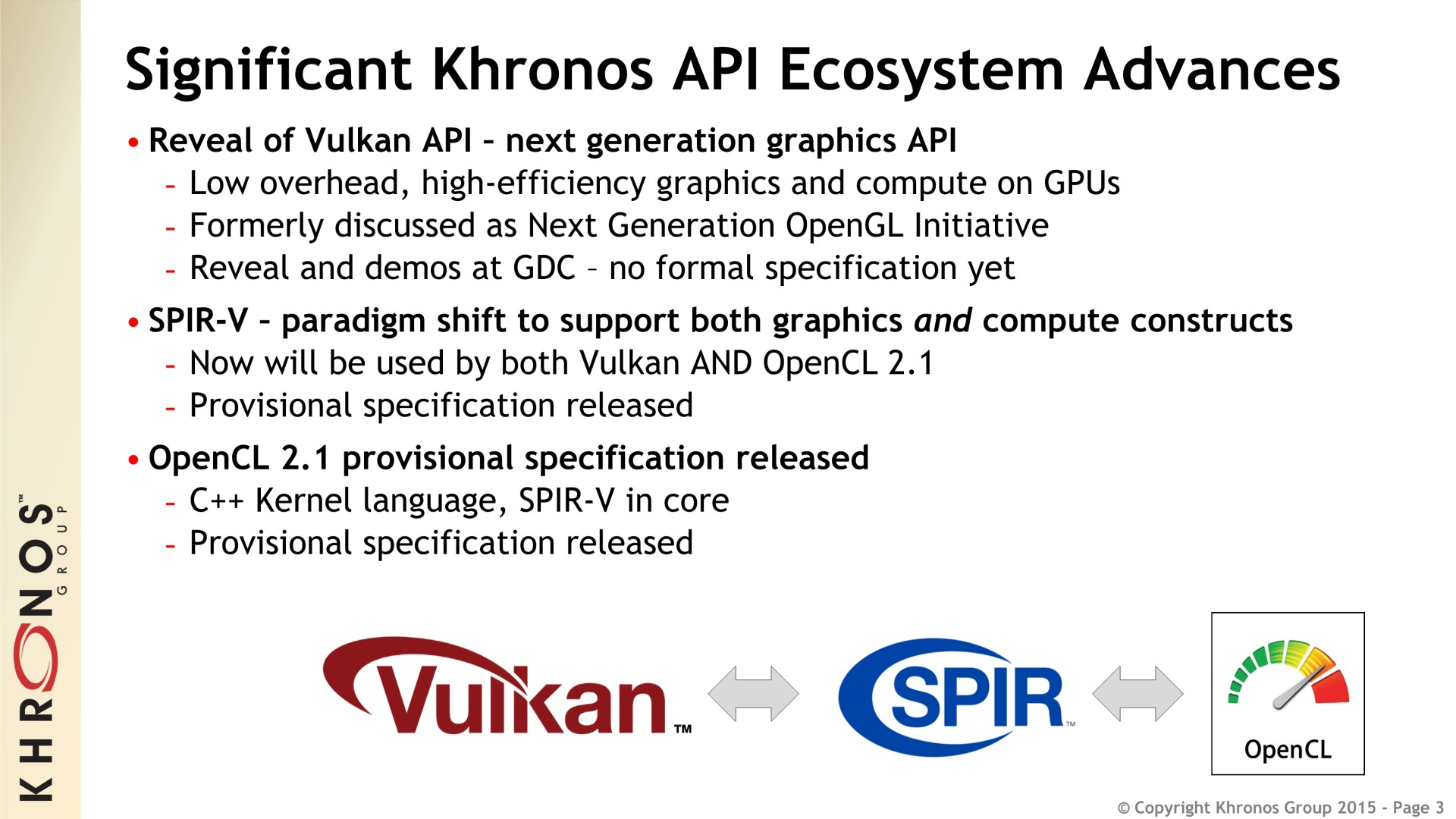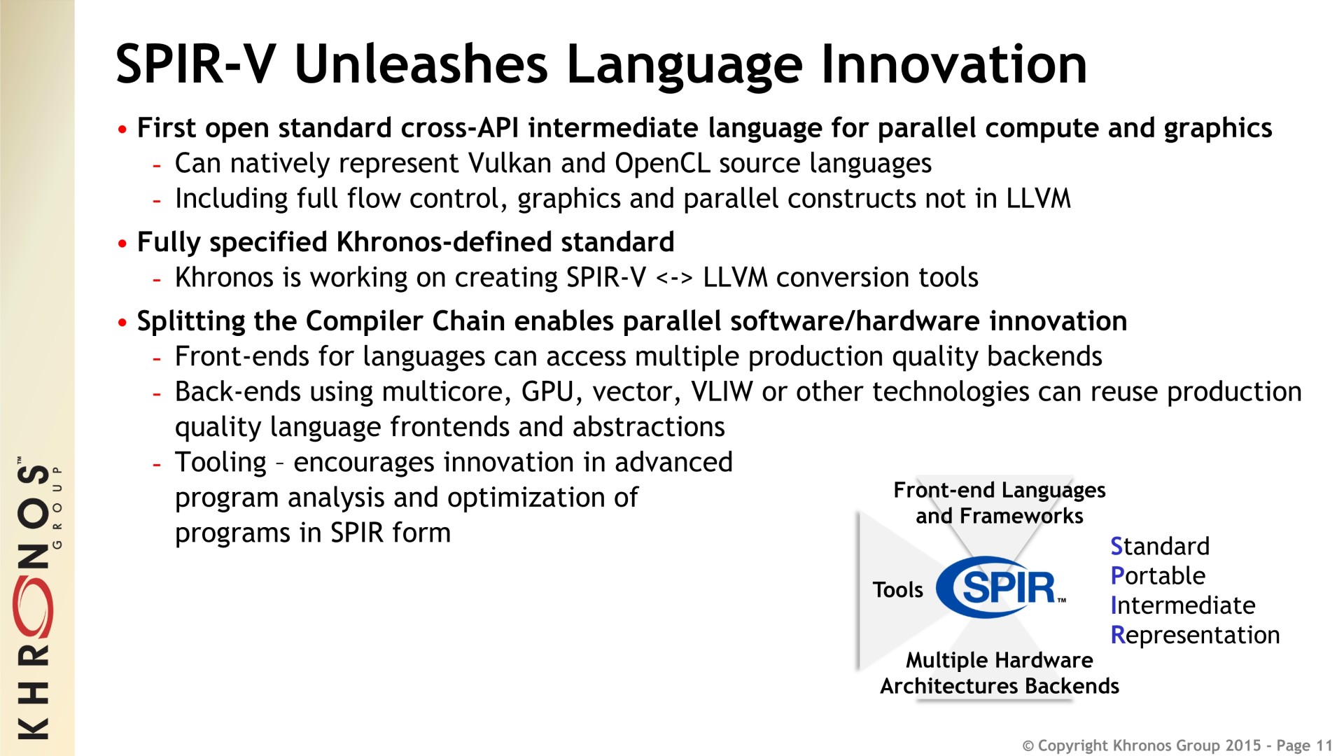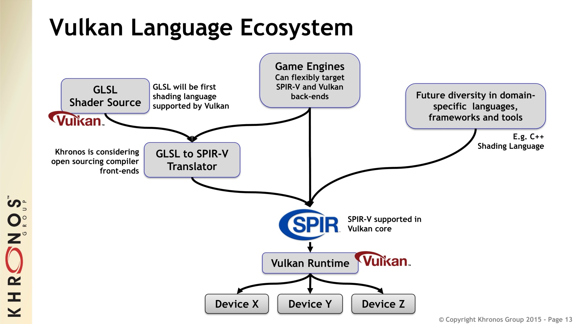 Pour éviter tout cela, Khronos introduit SPIR-V, un langage intermédiaire entre le code source et le code machine. Il s'agit d'une évolution du SPIR déjà disponible en OpenCL et qui sera d'ailleurs partagée par Vulkan ainsi que par le futur OpenCL 2.1. Les développeurs pourront précompiler leur code GLSL vers SPIR-V, et les meilleurs d'entre eux ainsi que les fournisseurs de moteurs graphiques pourront optimiser directement ce code SPIR-V.