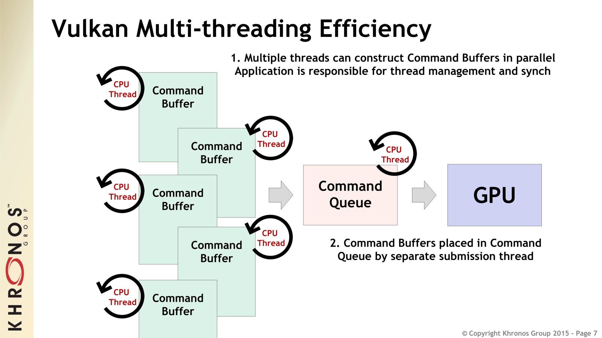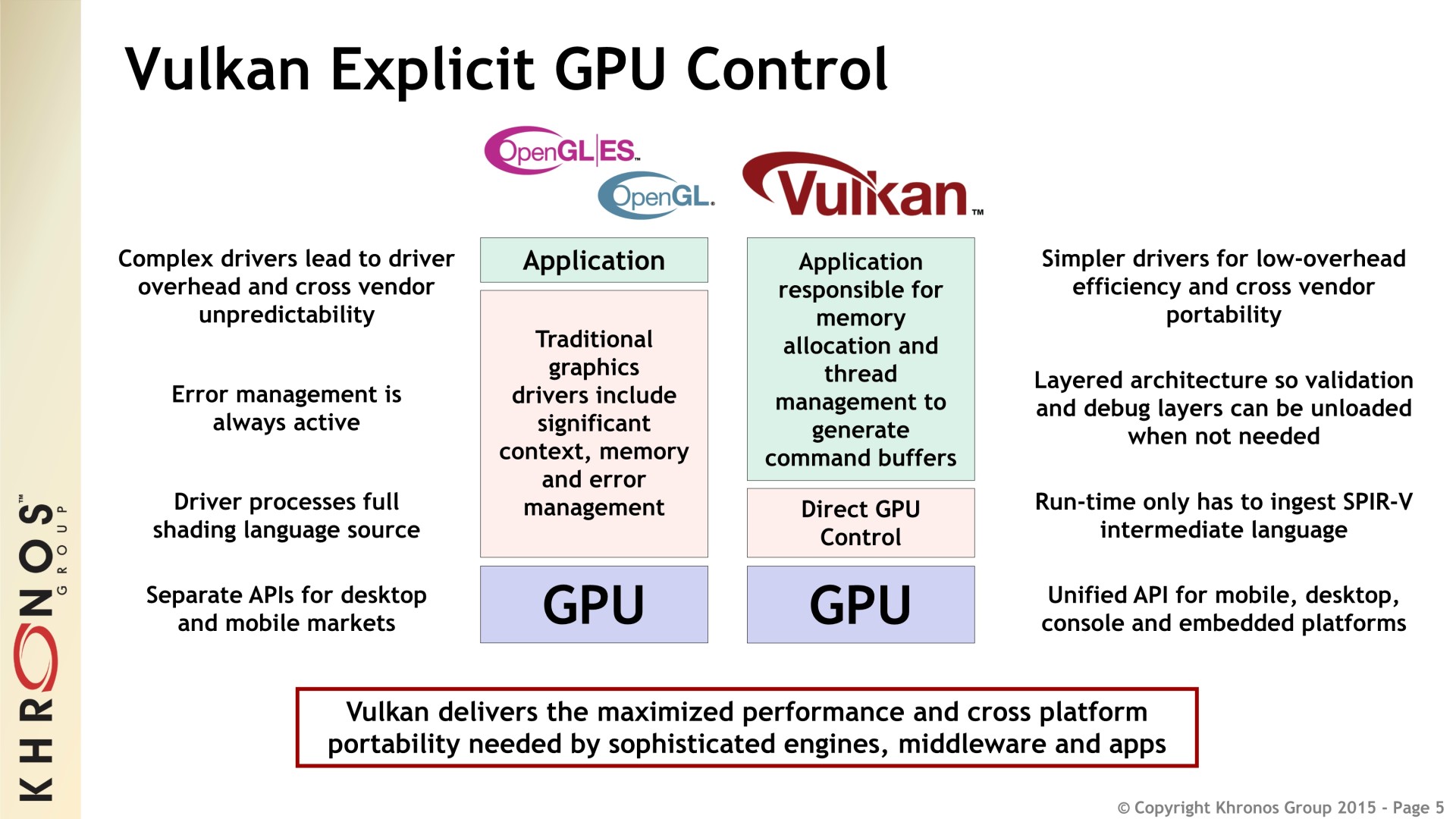 Comme les autres API de bas niveau, Vulkan offre un accès plus adapté aux GPU modernes, réduit le surcoût CPU des pilotes et permet l'implémentation d'un multi-threading efficace. Une API de plus bas niveau, qui rend le comportement du pilote GPU plus prédictible, facilite également la portabilité d'une plateforme à l'autre tout en conservant de bonnes performances, un point crucial pour tous les développeurs de moteurs de jeux et de middlewares.