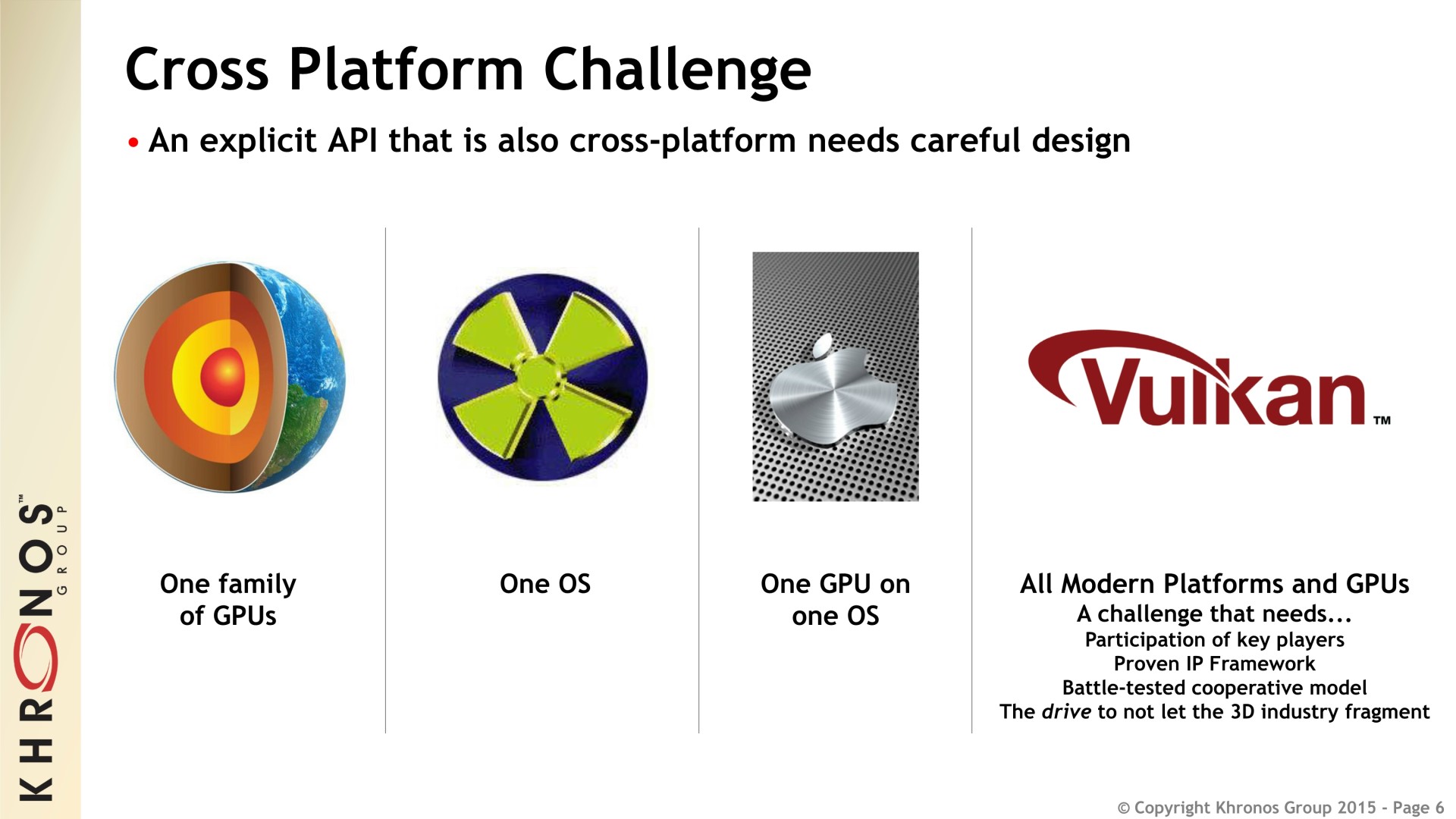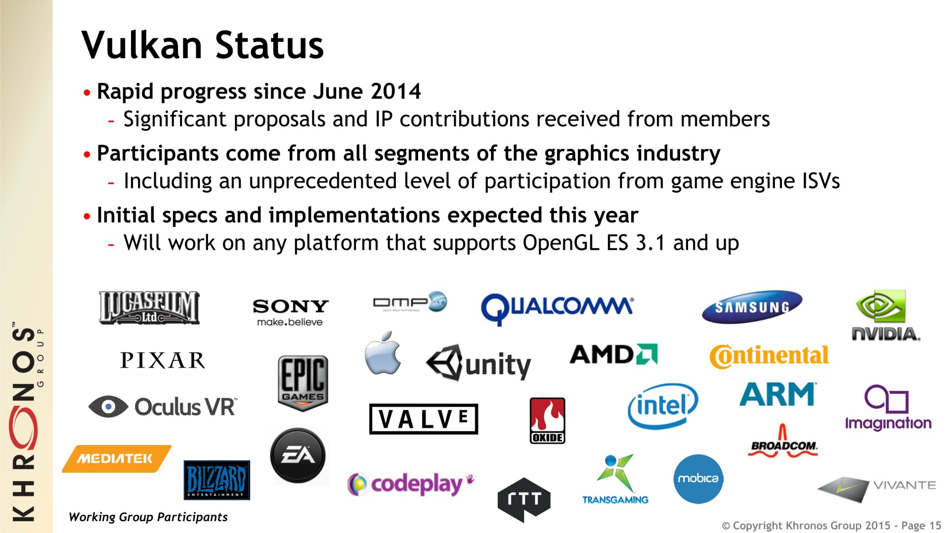 Dans le monde mobile, Khronos a tenté de gagner en agilité à travers une API dédiée et quelque peu simplifiée, OpenGL ES. Cela a plutôt bien fonctionné jusqu'ici, même si les 2 API partagent certaines limitations. Avec l'arrivée des API de plus bas niveau, initiée par AMD et Mantle, suivie par Microsoft et Direct3D 12 ainsi que par Apple et Metal, il y avait une vraie pression sur Khronos pour revoir en profondeur son API graphique. Une opportunité en fait puisqu'une pression suffisante était nécessaire pour parvenir à mettre d'accord, relativement rapidement, tous ses membres.