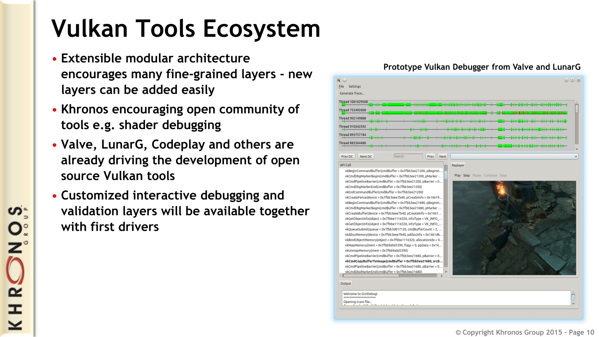 Khronos indique d'ailleurs avoir construit à l'intérieur de Vulkan des mécanismes dédiés spécifiquement à faciliter la portabilité, notamment au niveau du débogage. Des outils multiplateformes performants devraient ainsi pouvoir être proposés. Des développements dans ce sens son déjà bien avancés chez Valve, LunarG ou encore Codeplay.