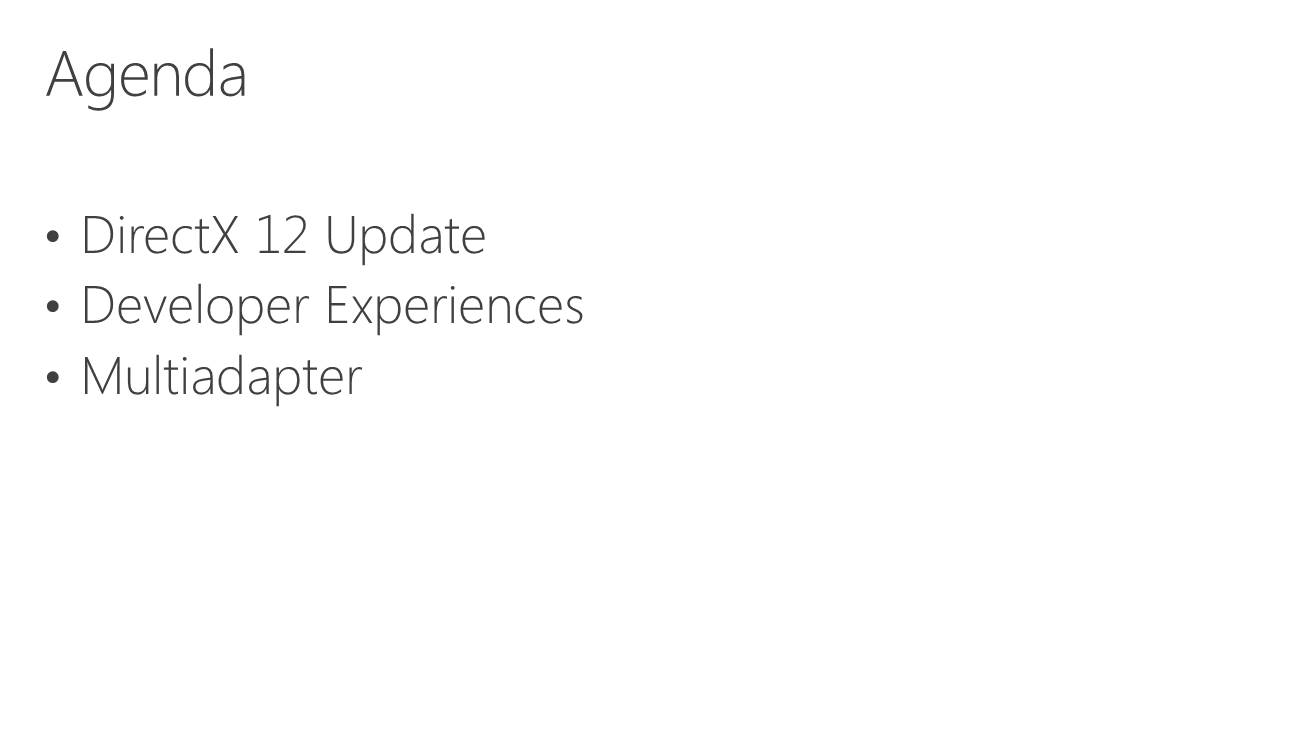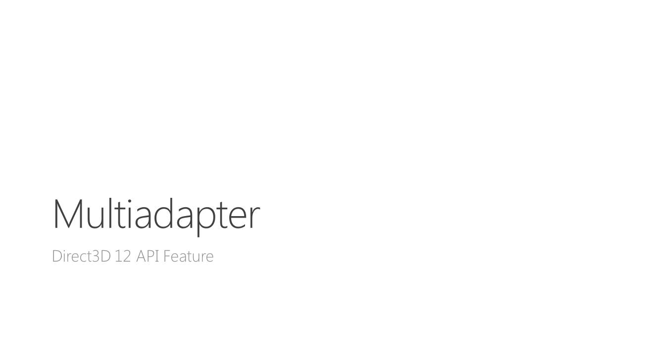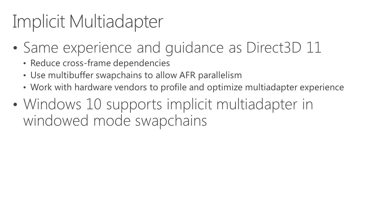 Direct3D 12, la composante graphique du prochain DirectX, supportera plusieurs modes de multi-GPU (multiadapter). Le premier est un mode de multi-GPU implicite, similaire à ce qui est utilisé actuellement par AMD et Nvidia sous Direct3D 11 ou OpenGL pour supporter le CrossFire et le SLI. Avec ce mode, les développeurs n'ont pas trop à se soucier du multi-GPU, les pilotes se chargeant de son support de façon à peu près transparente, même s'ils doivent faire en sorte qu'il n'y ait pas de dépendance entre les images, puisqu'il s'agit en général d'un rendu des images en alternance (AFR).