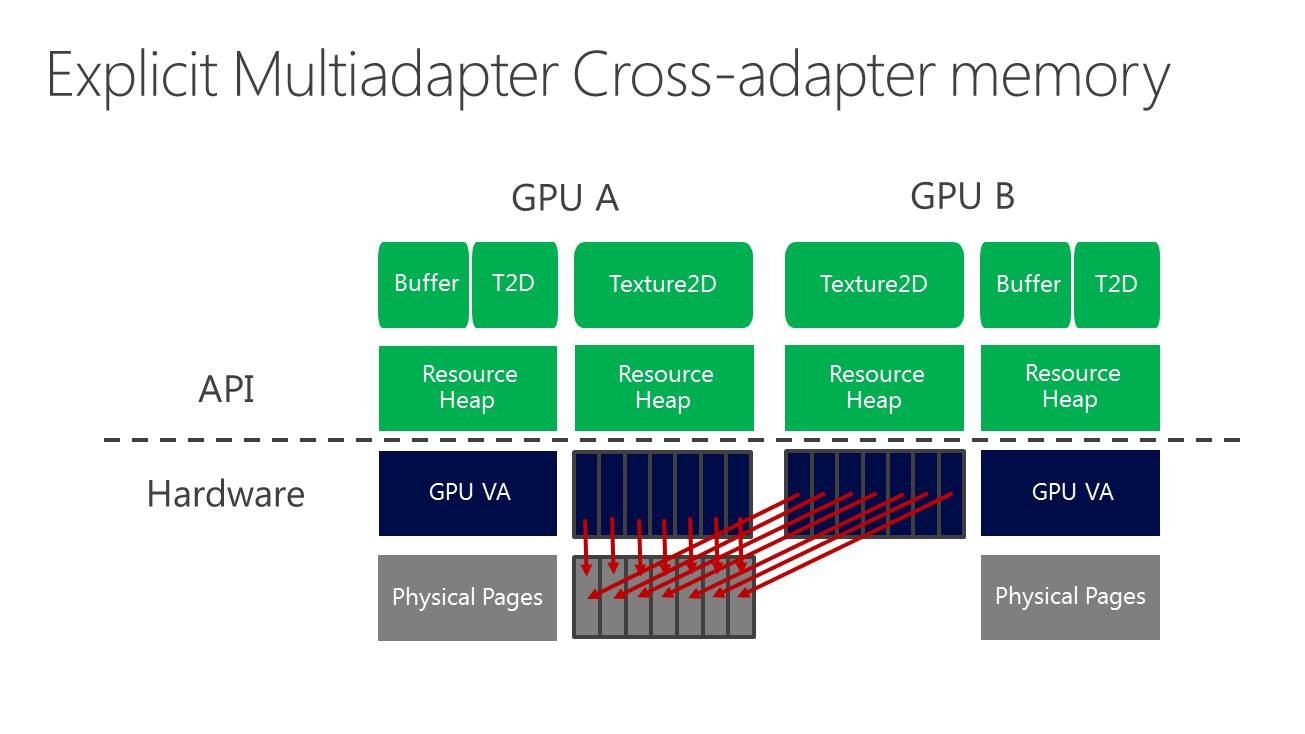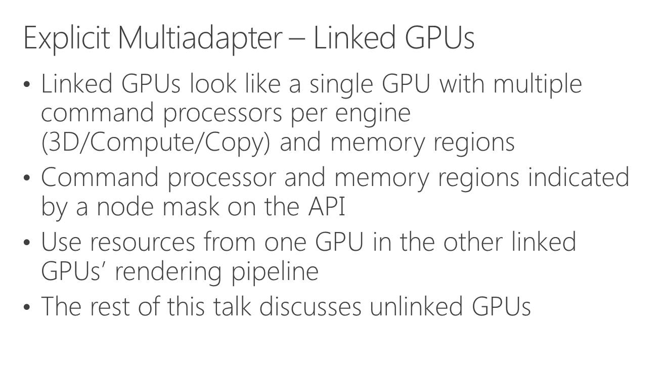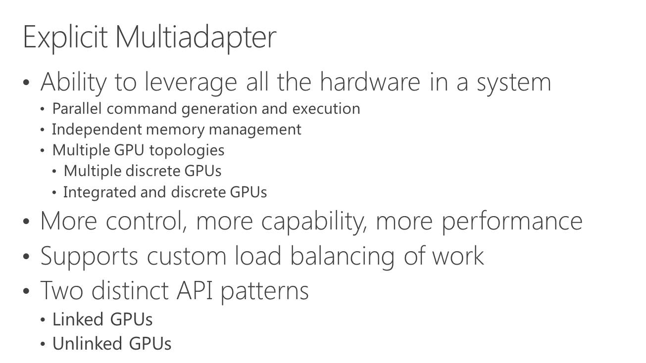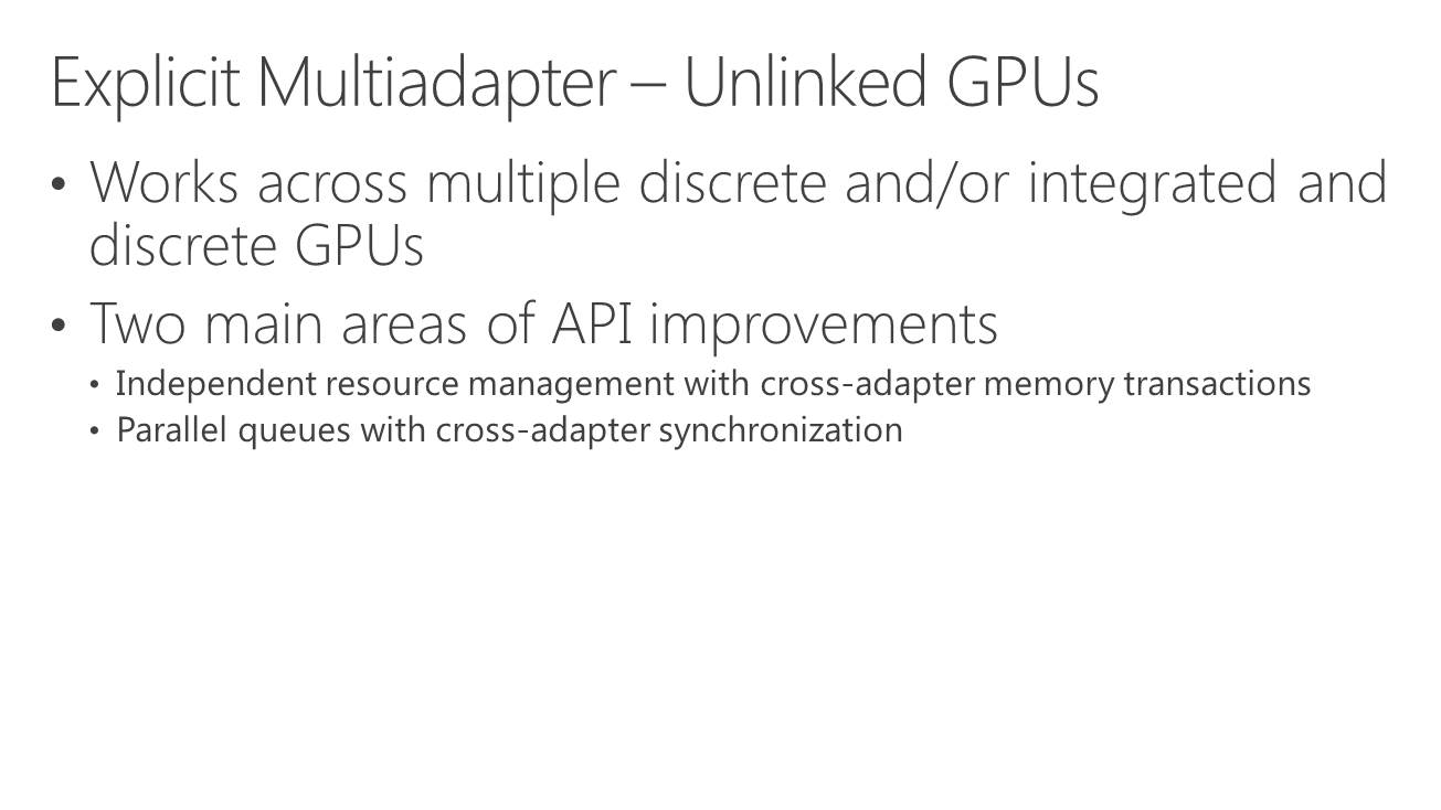 A partir de là, deux sous modes peuvent être exploités. Le multi-GPU explicite lié (linked) est proche des CrossFire et SLI actuels (il en exploite le moteur de composition), si ce n'est que les développeurs prennent le contrôle. L'ensemble est vu comme un seul gros GPU qui dispose de plus de moteurs de types graphics, compute et copy. Ce mode pourrait par exemple permettre de supporter plus facilement un rendu de type AFR malgré certaines dépendances entre images. Microsoft n'est pas rentré dans les détails à ce niveau et s'est contenté d'indiquer qu'ils seraient communiqués plus tard. Nous ne savons pas non plus si AMD et Nvidia conserveront la mains sur les combinaisons supportées (par exemple 2 GTX 980 et pas GTX 980 + GTX 970).