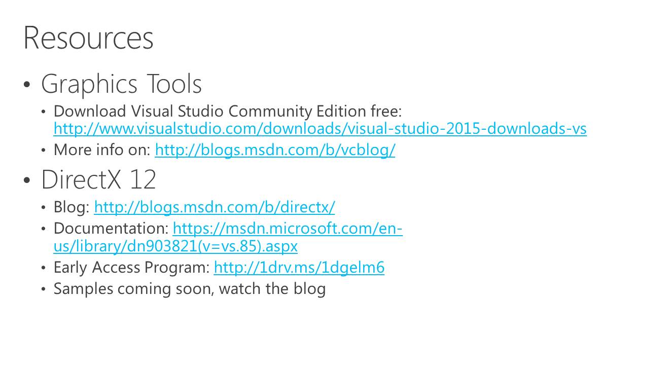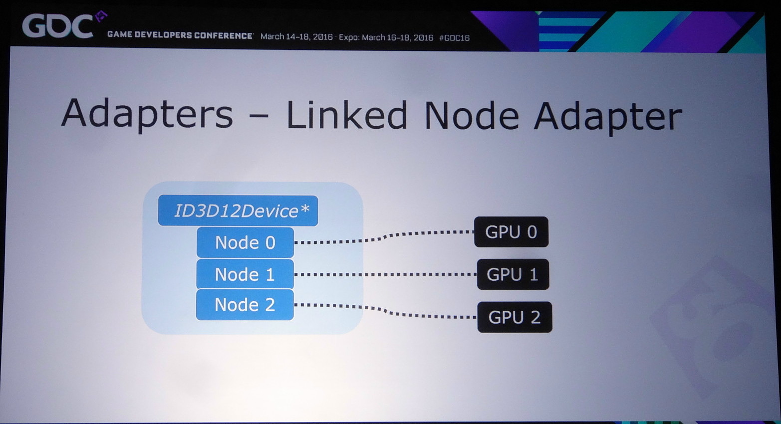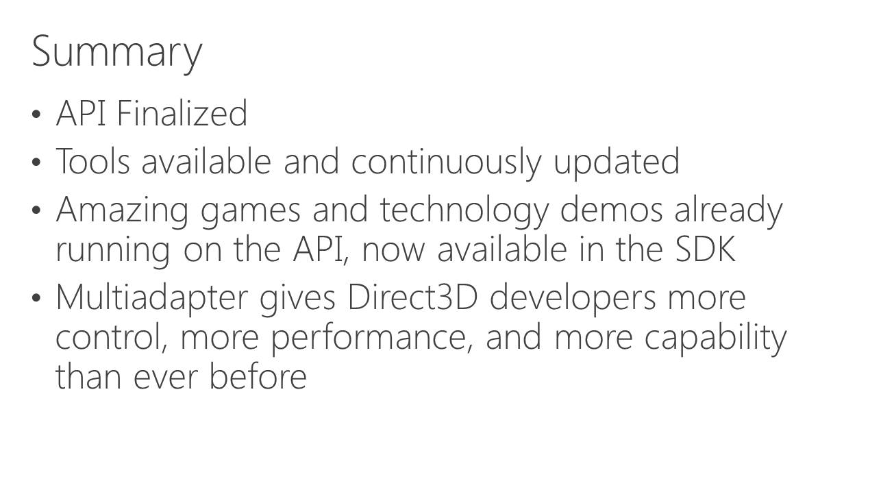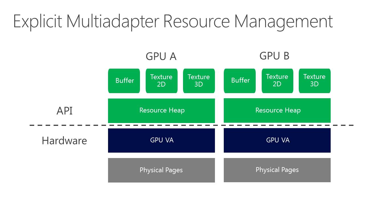 A partir de là, deux sous modes peuvent être exploités. Le multi-GPU explicite lié (linked) est proche des CrossFire et SLI actuels (il en exploite le moteur de composition), si ce n'est que les développeurs prennent le contrôle. L'ensemble est vu comme un seul gros GPU qui dispose de plus de moteurs de types graphics, compute et copy. Ce mode pourrait par exemple permettre de supporter plus facilement un rendu de type AFR malgré certaines dépendances entre images. Microsoft n'est pas rentré dans les détails à ce niveau et s'est contenté d'indiquer qu'ils seraient communiqués plus tard. Nous ne savons pas non plus si AMD et Nvidia conserveront la mains sur les combinaisons supportées (par exemple 2 GTX 980 et pas GTX 980 + GTX 970).