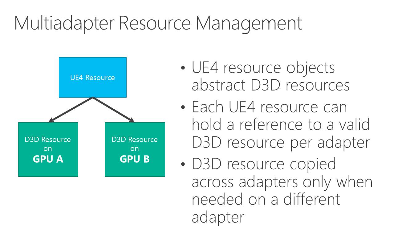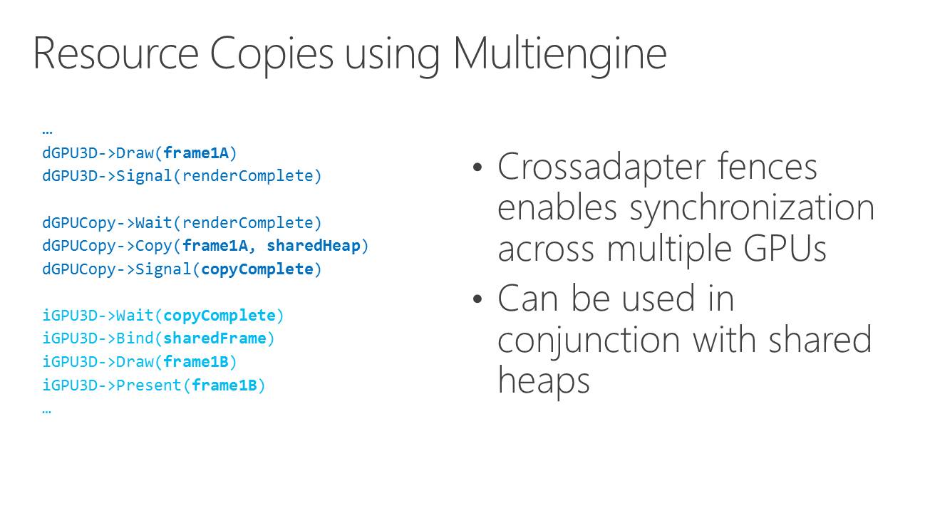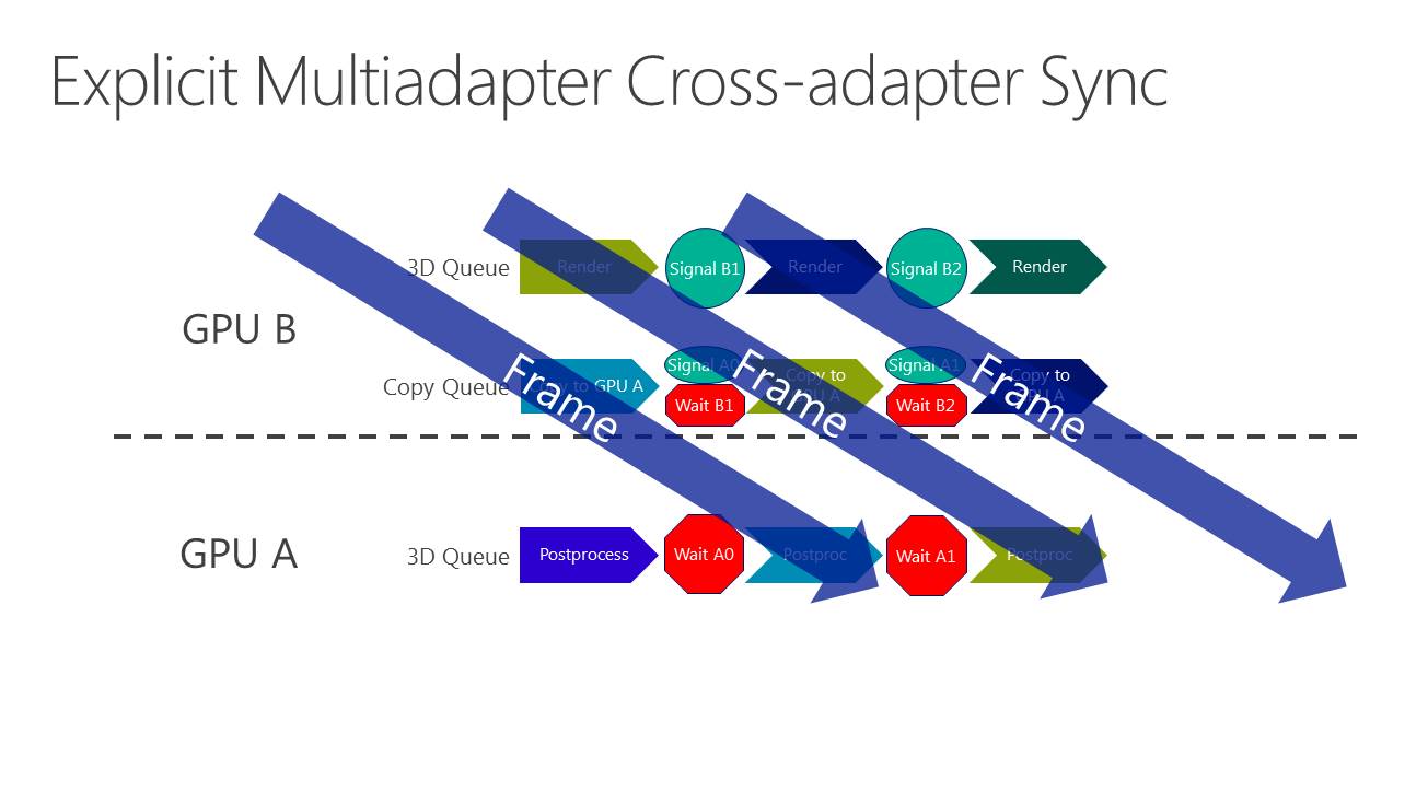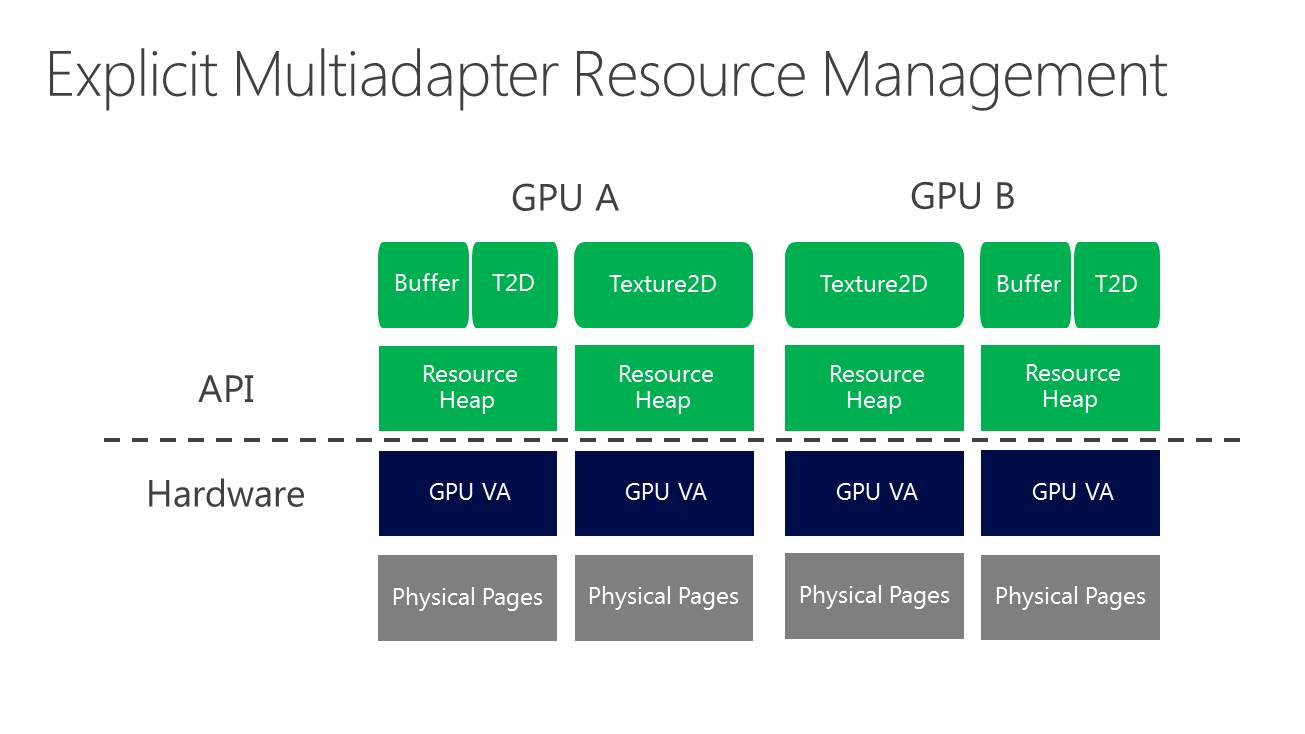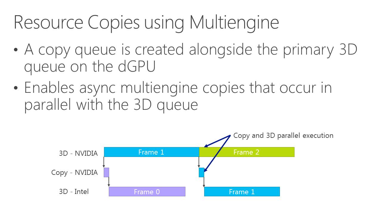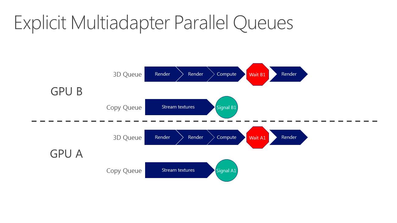 La nouveauté c'est le support du mode multi-GPU explicite, ou plutôt des modes explicites. Dans ces cas de figures, le contrôle du multi-GPU revient aux développeurs qui pourront en faire à peu près tout ce qu'ils veulent. Ce support est basé sur l'extension de la gestion par Direct3D de différents moteurs pour piloter un GPU (graphics, compute, copy), fonctionnalité qui permet pour rappel de profiter du parallélisme entre différents types de tâches, comme expliqué ici. En multi-GPU explicite, ces différents moteurs seront exposés pour chaque GPU.