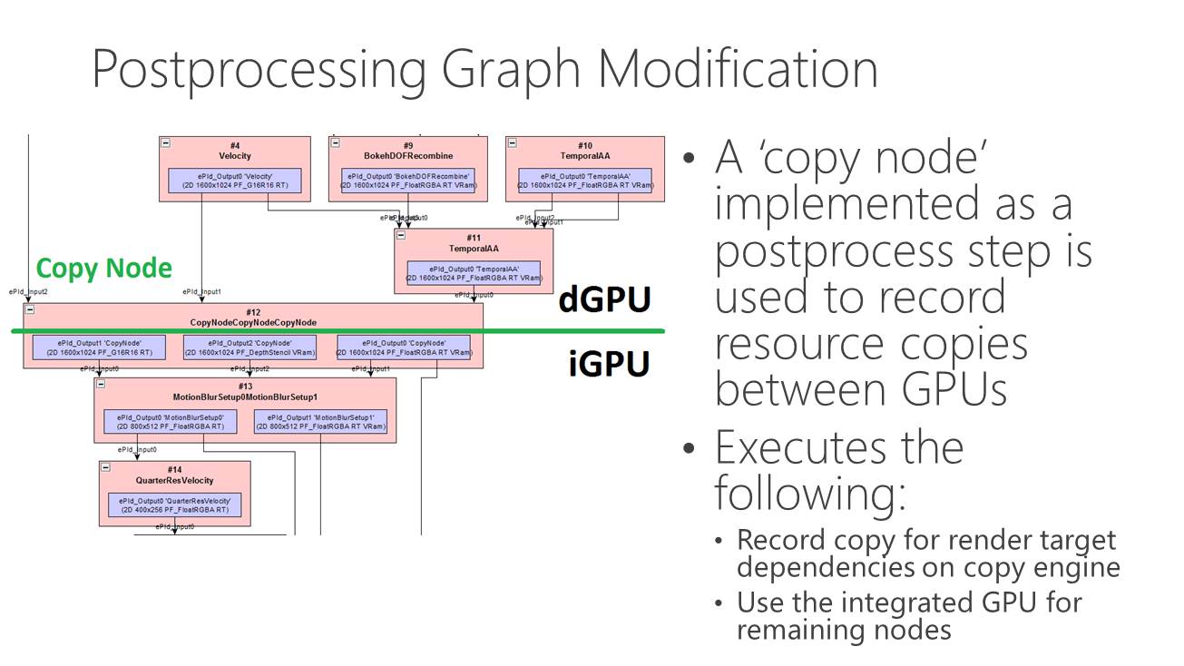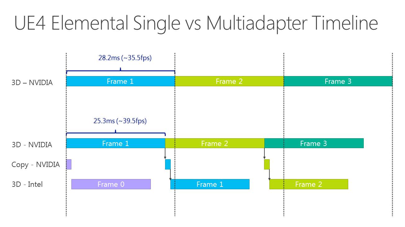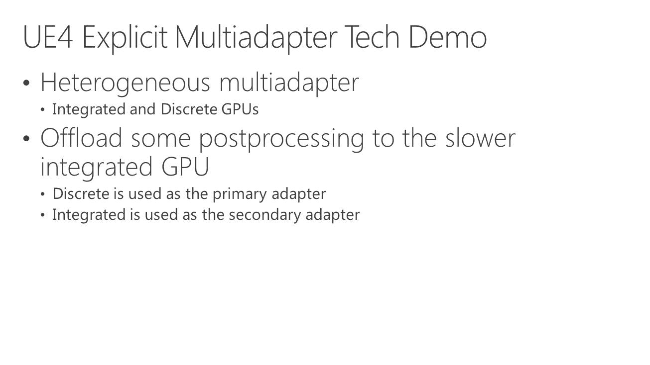 Dans l'immédiat, l'utilisation réaliste du multi-GPU explicite non-lié est différente. Il s'agit plutôt de faire traiter par chaque GPU différentes étapes du rendu, ce qui évite tout souci de qualité et de clignotement. C'est d'ailleurs ce qu'a choisi d'illustrer Microsoft qui a pour l'occasion modifié quelque peu l'Unreal Engine 4 de manière à déporter certaines tâches d'une carte graphique Nvidia vers un GPU intégré Intel.