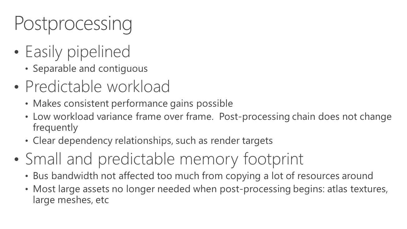 Plus spécifiquement, l'opération permet de passer de 35.9 à 39.7 fps, soit un gain de 10%. En observant de plus près cet exemple, il apparaît que le GPU intégré prend beaucoup plus de temps pour traiter la partie finale du post processing que la carte graphique, mais ce dernier n'ayant rien d'autre à faire, cela permet un gain de performances. C'est probablement surtout vrai pour les GPU d'entrée voire de milieu de gamme (Microsoft ne précise pas la configuration) alors qu'il serait peut-être contreproductif de vouloir aider une GeForce GTX Titan X avec un GPU intégré.