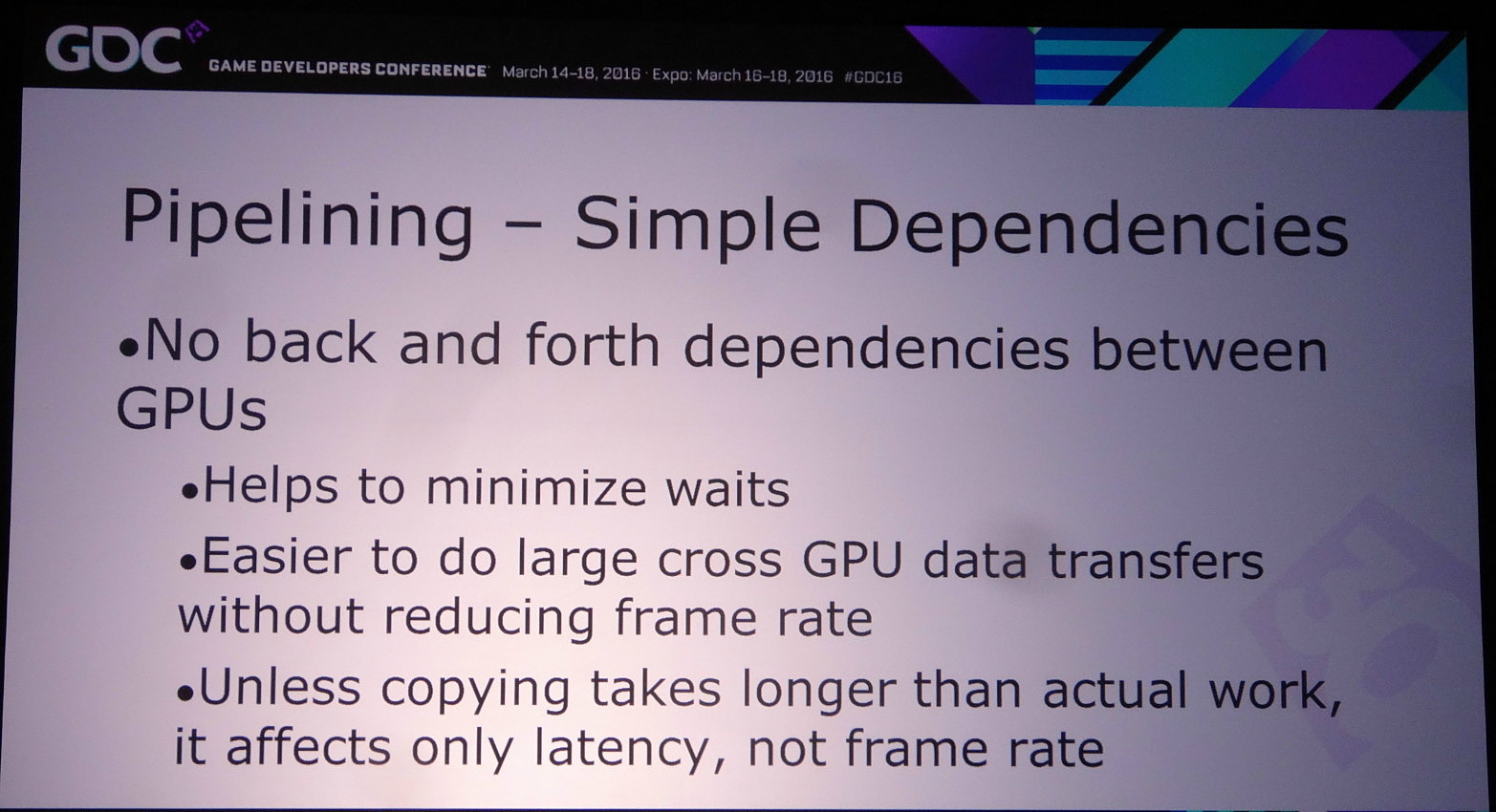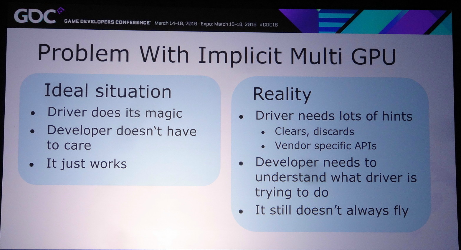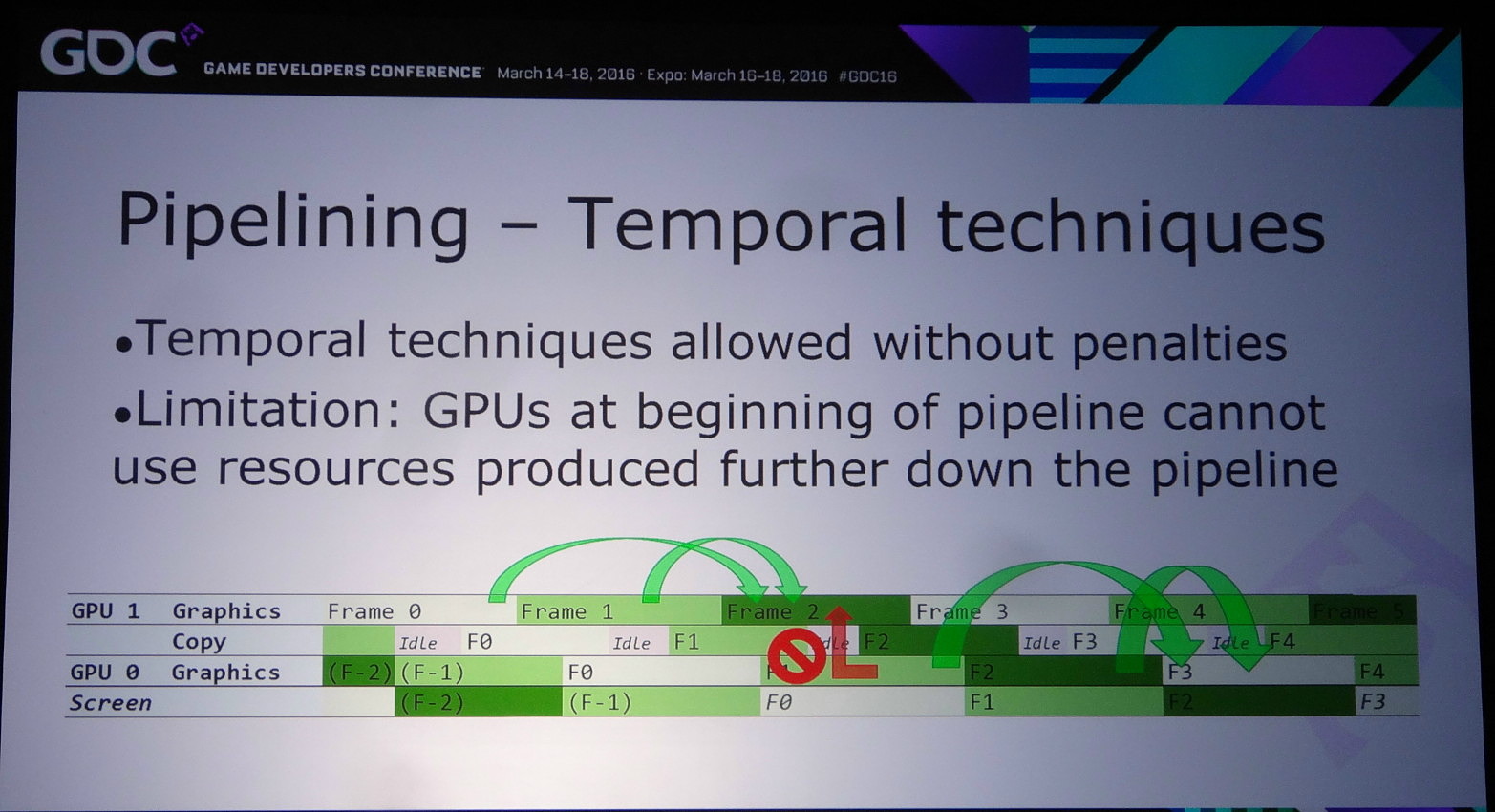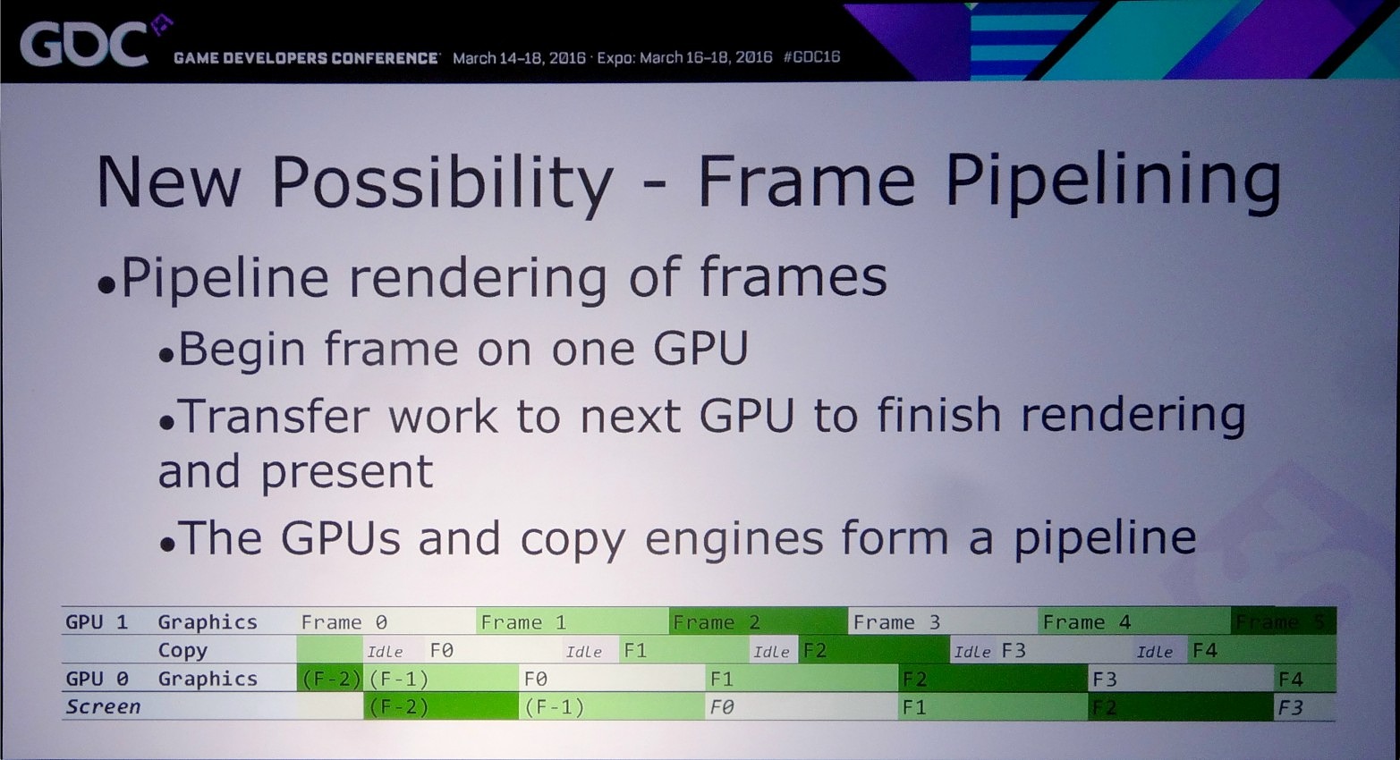 Lors de la journée de la GDC consacrée aux tutoriaux liés à DirectX 12, organisée par AMD et Nvidia, c'est ce dernier qui s'est chargé de présenter la partie multi-GPU et de distiller des conseils d'utilisation réalistes pour le nouveau mode explicite. Les combinaisons exotiques laissées de côté, c'est le frame pipelining sur base d'une configuration de GPU identiques qui est mis en avant.
