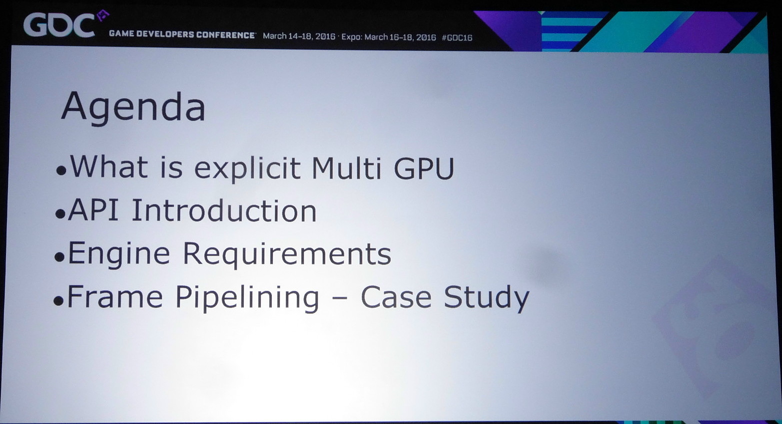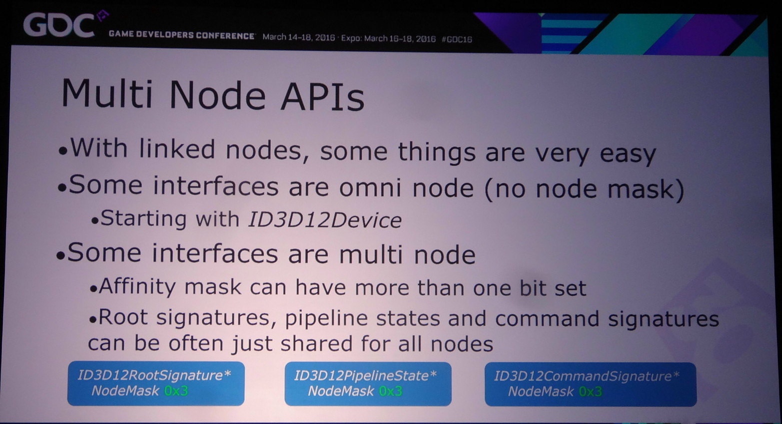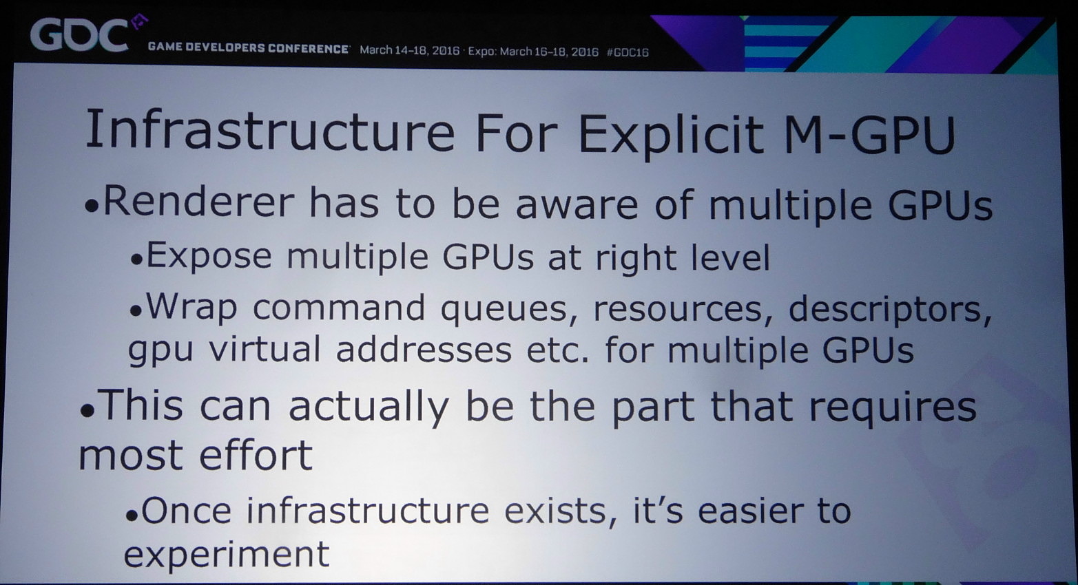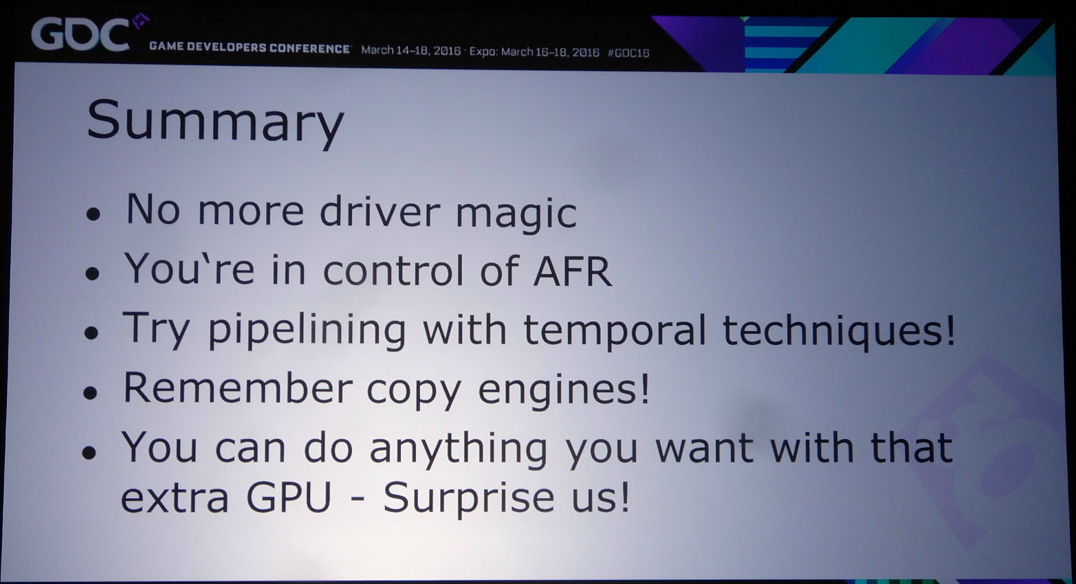 Lors de la journée de la GDC consacrée aux tutoriaux liés à DirectX 12, organisée par AMD et Nvidia, c'est ce dernier qui s'est chargé de présenter la partie multi-GPU et de distiller des conseils d'utilisation réalistes pour le nouveau mode explicite. Les combinaisons exotiques laissées de côté, c'est le frame pipelining sur base d'une configuration de GPU identiques qui est mis en avant.