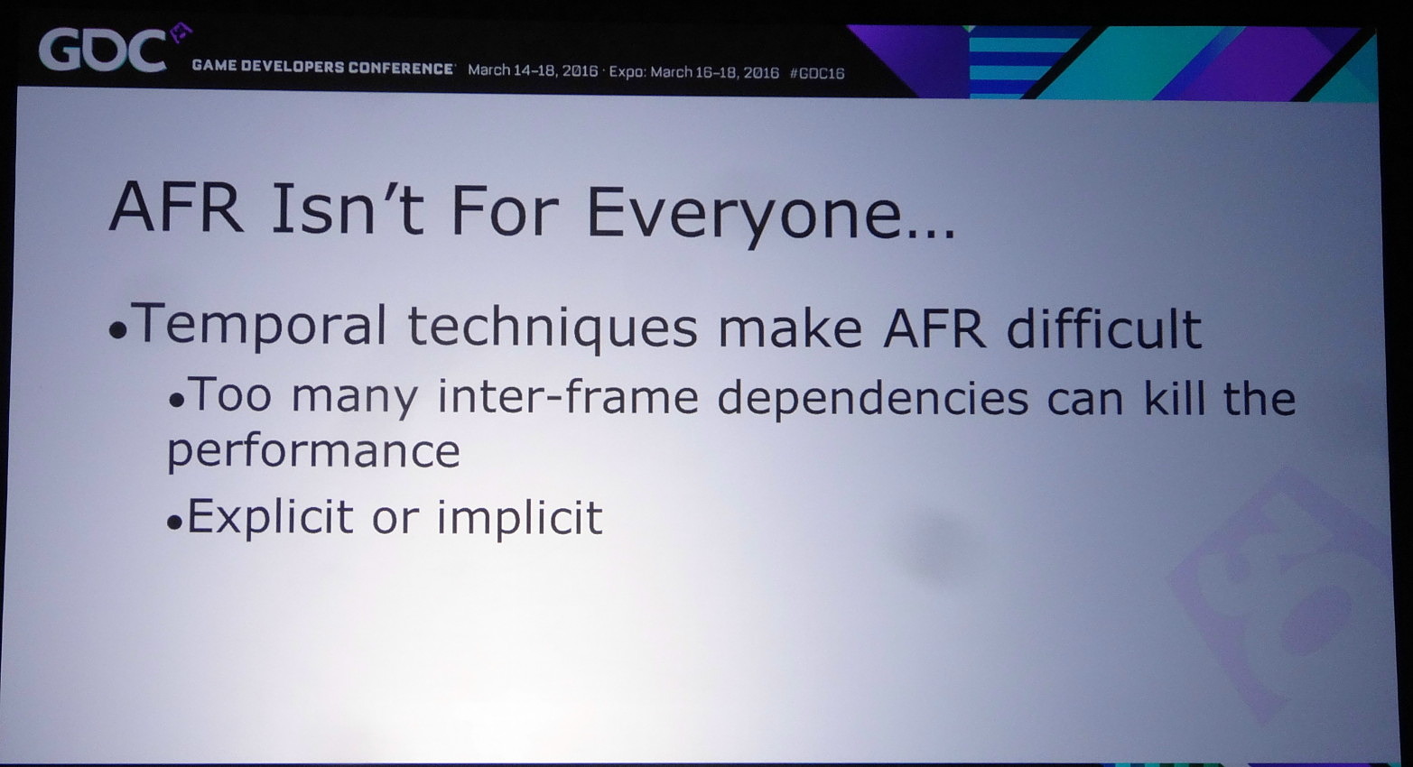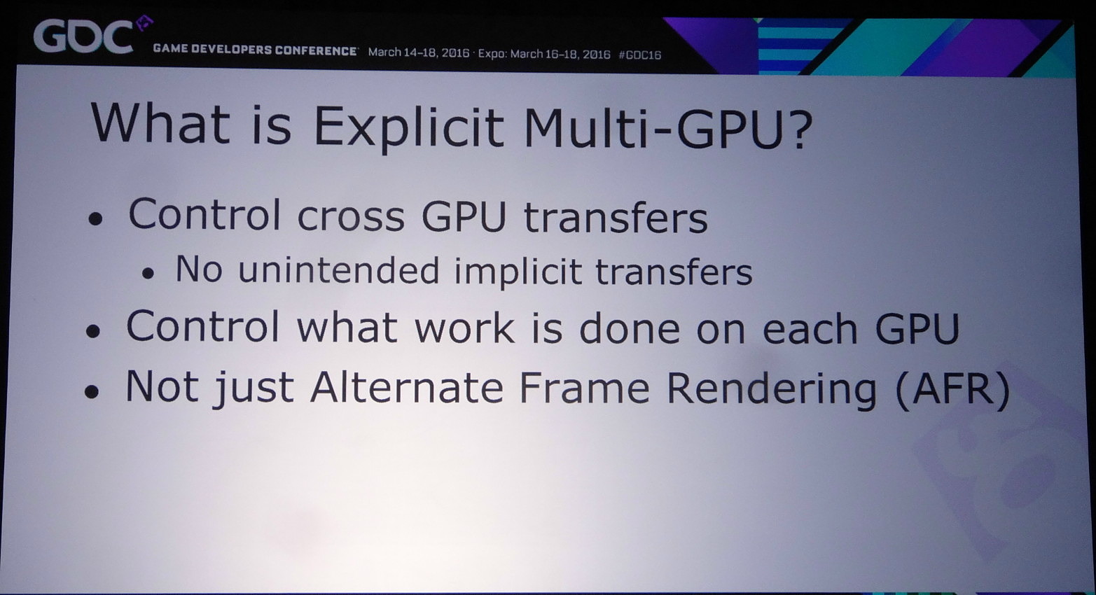 Si exploiter le mode explicite lié peut permettre de faire de l'AFR (alternate frame rendering) avec un peu plus de flexibilité qu'en mode implicite, son intérêt réside surtout dans la possibilité d'implémenter d'autres modes de rendu, notamment pour résoudre les problèmes liés aux techniques qui font appel à une composante temporelle.