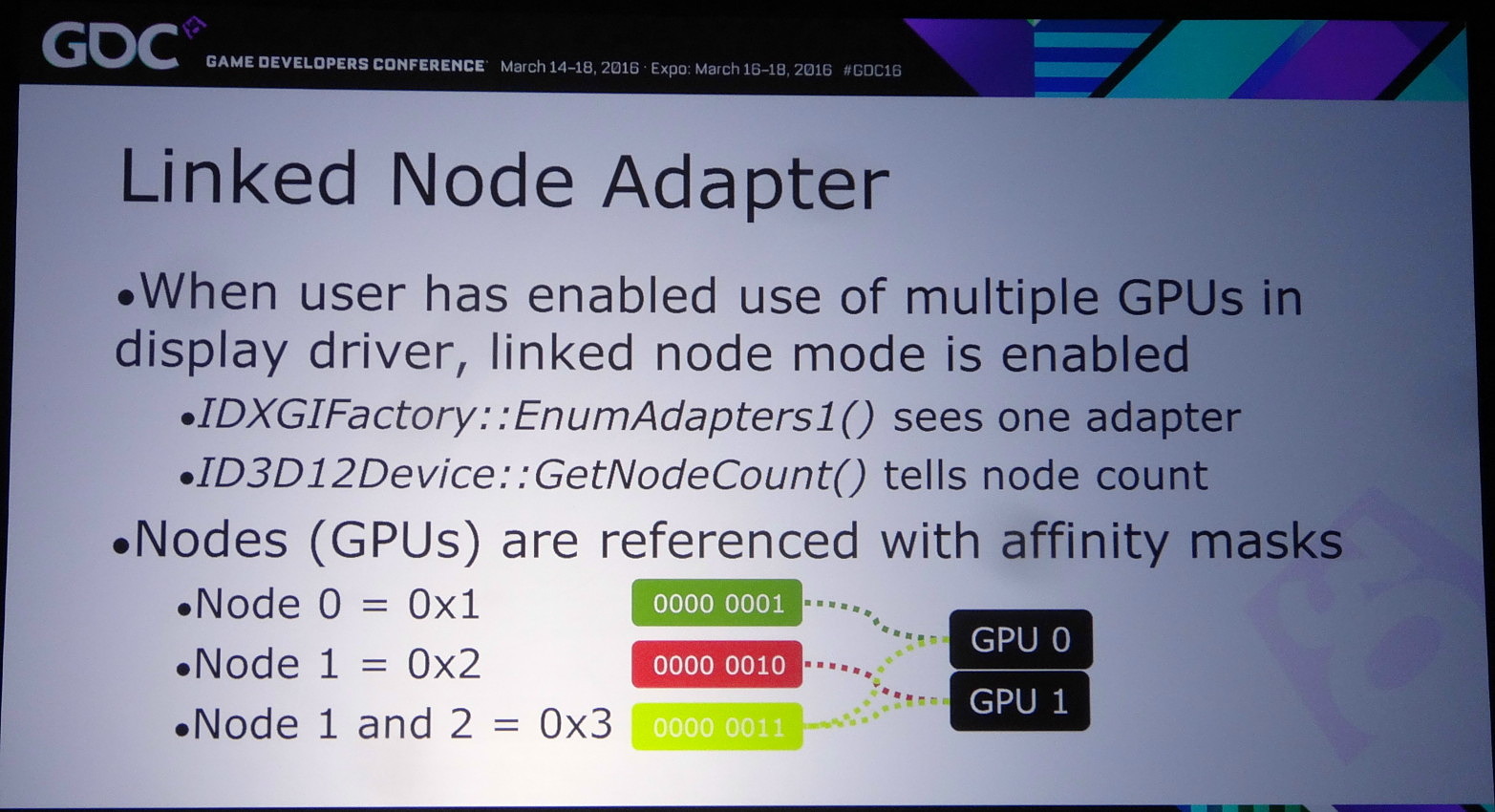 Reste alors le mode explicite à noeud lié (linked node), un noeud représentant un ensemble de GPU activé au niveau des pilotes. Autant AMD que Nvidia exposent un tel noeud dès que le CrossFire ou le SLI sont enclenchés dans leurs panneaux de contrôle. Attention, cela ne veut pas dire que le multi-GPU fonctionnera automatiquement ! Tout le contrôle reste dans les mains des développeurs mais ils ont alors l'assurance d'avoir affaire à des GPU identiques ou similaires, ce qui simplifie leur travail. Tout du moins pour le moment puisqu'il n'est pas impensable qu'AMD et Nvidia autorisent des noeuds hétérogènes dans le futur.