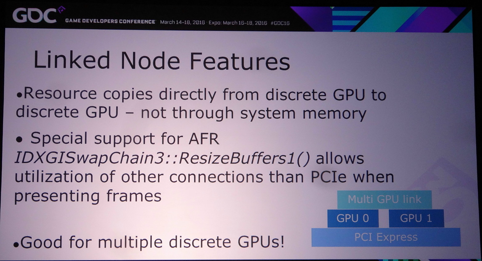 Ce mode explicite lié donne également accès à un lien dédié éventuel, soit au point SLI dans le cas des GPU Nvidia, AMD ayant abandonné le lien CrossFire au profit exclusif du PCI Express. Cet accès spécial n'est cependant exploité que si le multi-GPU implémenté est de type AFR. Le reste des transferts se fait via le bus PCI Express mais directement de GPU à GPU.
