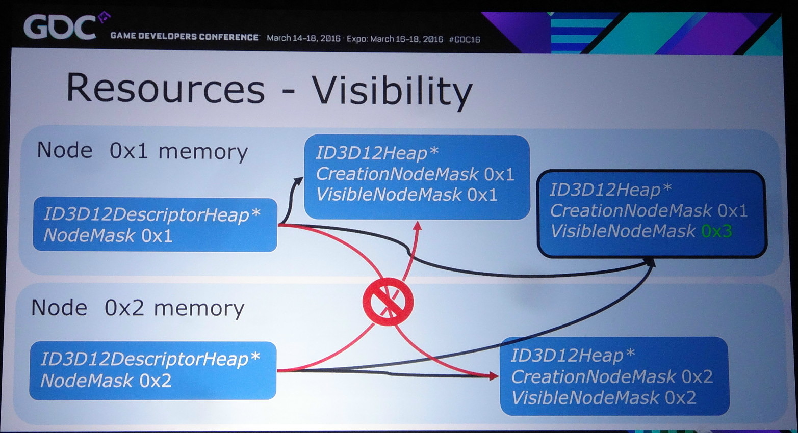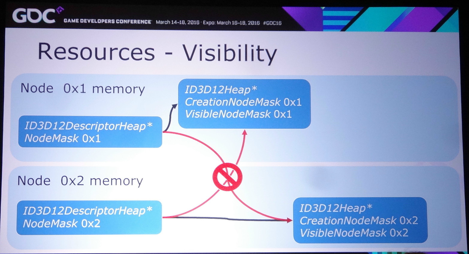 Nvidia rappelle ensuite qu'il existe différents tiers pour le partage de ressources à l'intérieur d'un noeud. Ce niveau de support est exposé à travers D3D12_CROSS_NODE_SHARING_TIER. Deux niveaux sont possibles : le tiers 1 ne supporte que les copies entre GPU alors que le tiers 2 autorise les accès à certaines ressources présentes dans la mémoire d'un autre GPU. Un dernier mode, le tiers 1 émulé est également proposé et consiste à implémenter dans les pilotes un mécanisme de transfert lorsque la copie directe de GPU à GPU n'est pas supportée.