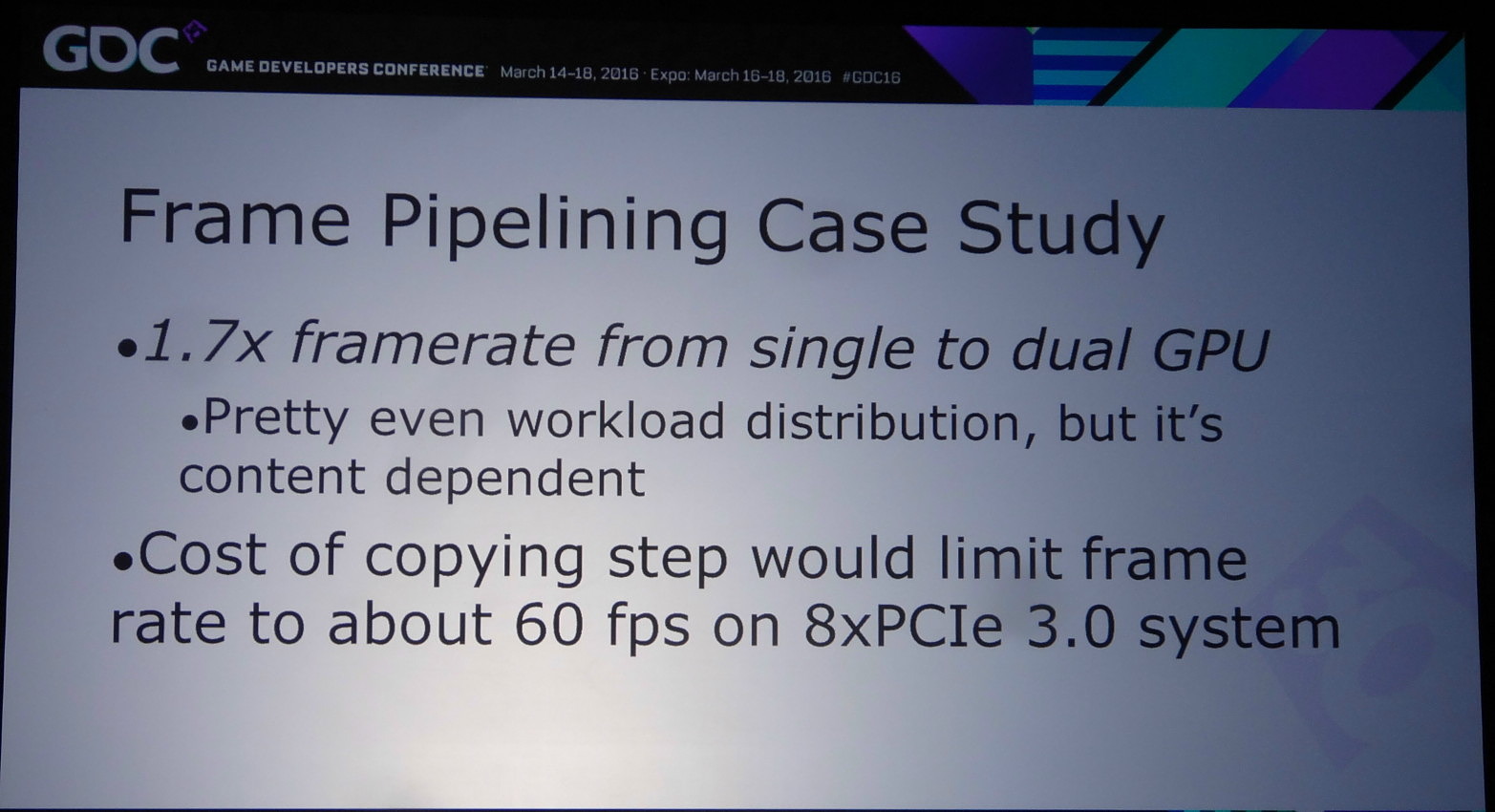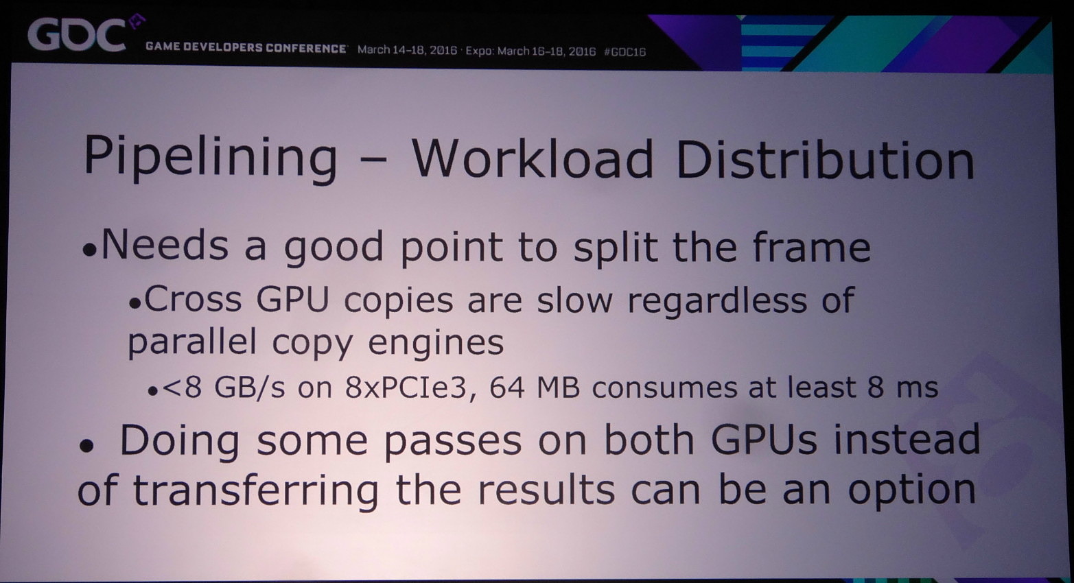 Pour mettre en place le frame pipelining, il faut parvenir à scinder son rendu en deux phases qui représentent une charge à peu près similaire et à un niveau qui permette de limiter les données à transférer. Il ne faut en effet pas oublier qu'un transfert de 64 Mo à travers un bus PCIe 3.0 8x prend au moins 8 ms, en général un peu plus en pratique. Pour éviter de transférer trop de données il peut alors être censé de dédoubler sur chaque GPU le calcul de certains éléments.