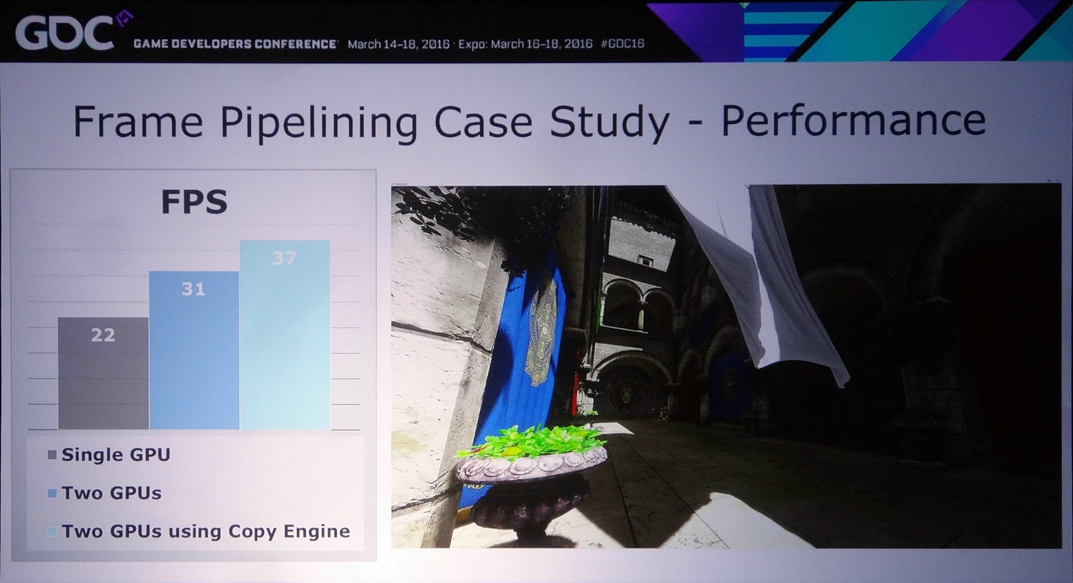 Dans l'exemple pris par Nvidia, le bi-GPU implémenté via le frame pipelining permet à la base de passer de 22 à 31 fps (+41%) et de monter à 37 fps (+68%) en exploitant le copy engine. Cet exemple est cependant un stress test en haute résolution (2160p) qui implique le transfert de la shadow map, du depth buffer et du SSAO, ce qui représente 87.3 Mo et prend à peu près 15 ms en PCIe 3.0 8x. Un temps de transfert qui limite le nombre de fps à +/- 60.
