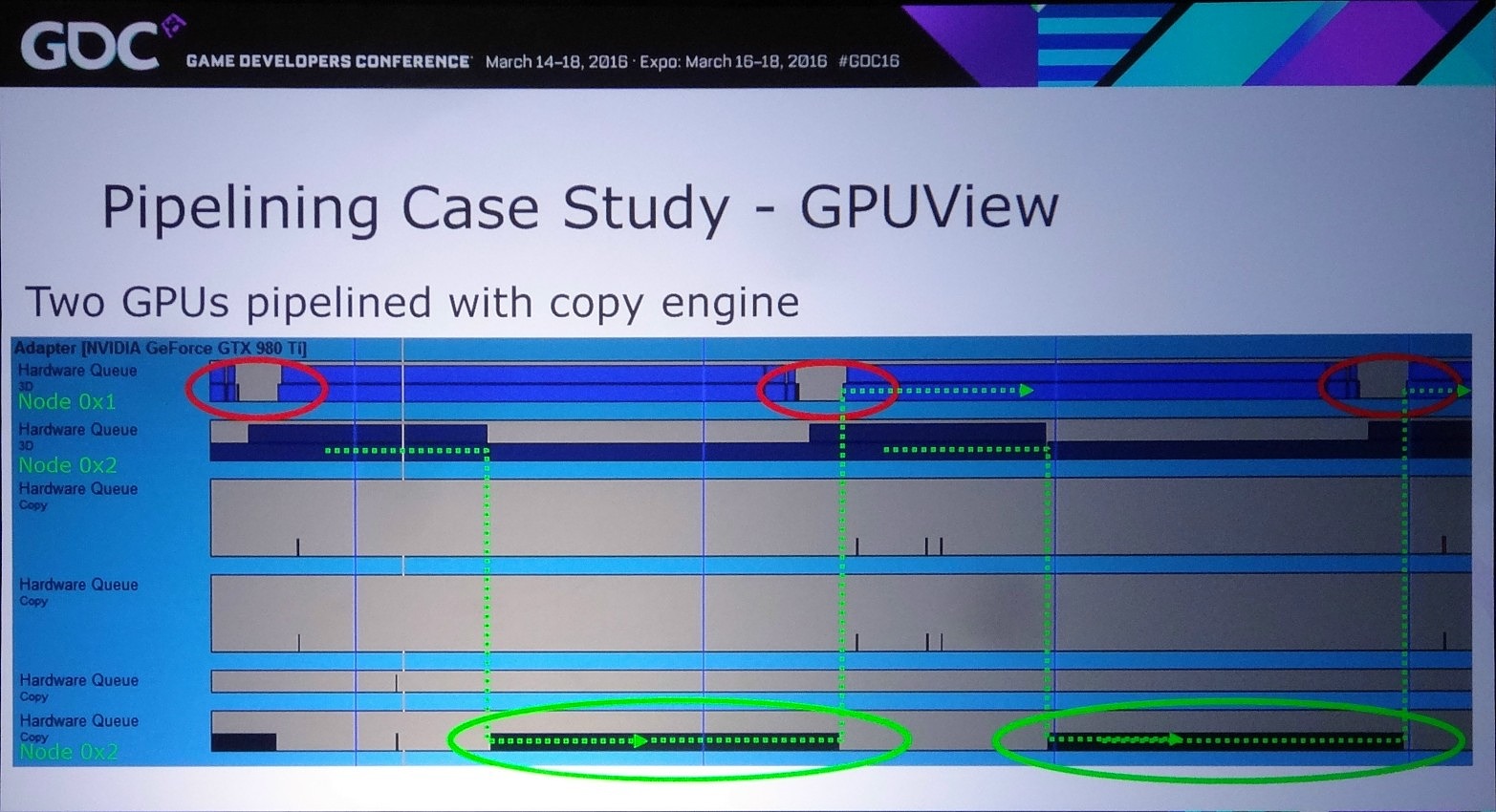 D'ailleurs, pour maximiser les performances, il est important d'avoir recours à une file dédiée de type copy pour organiser les transferts entre GPU. De quoi effectuer ces opérations en parallèle du rendu 3D et en masquer le coût. Si les GPU Nvidia ont du mal avec les files graphics et compute, ils n'ont par contre pas de problème pour traiter simultanément des files graphics et copy, tout du moins dans le cas des GPU Maxwell 2 qui disposent de deux moteurs de transferts DMA. A ce point, nous ne savons pas si les GPU précédents qui s'en contentent d'un seul pourraient être affectés.