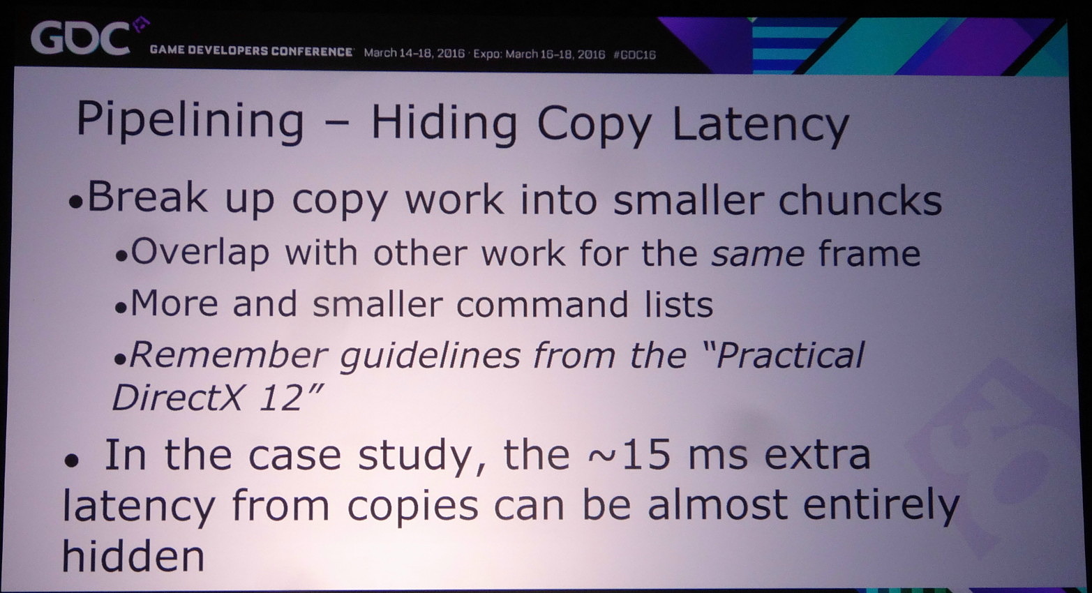 Le problème restant avec cette approche concerne la latence qui augmente à peu près comme en mode AFR. Le GPU1 effectue tout son travail, les données sont transférées puis le GPU effectue son travail. A 60 fps, et par rapport à un gros GPU de puissance équivalente, cela implique un triplement de la latence (de 16.7 ms à près de 50 ms). Heureusement, la partie liée au transfert de cette latence supplémentaire peut être masquée, exactement comme le fait Oxide pour le mode Async Compute d'AotS. Il suffit de décomposer le rendu en plus petits groupes de commandes et de transférer progressivement les éléments entre les GPU à travers le copy engine.